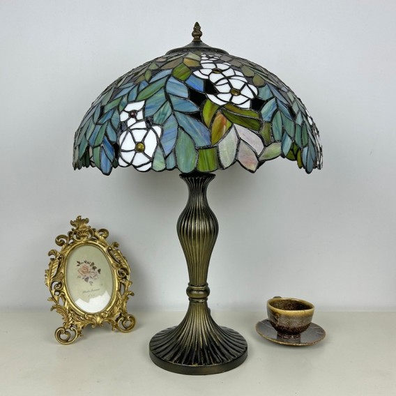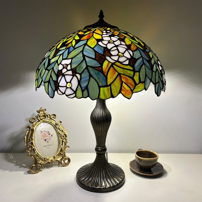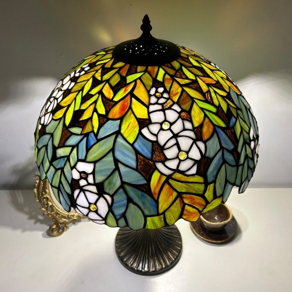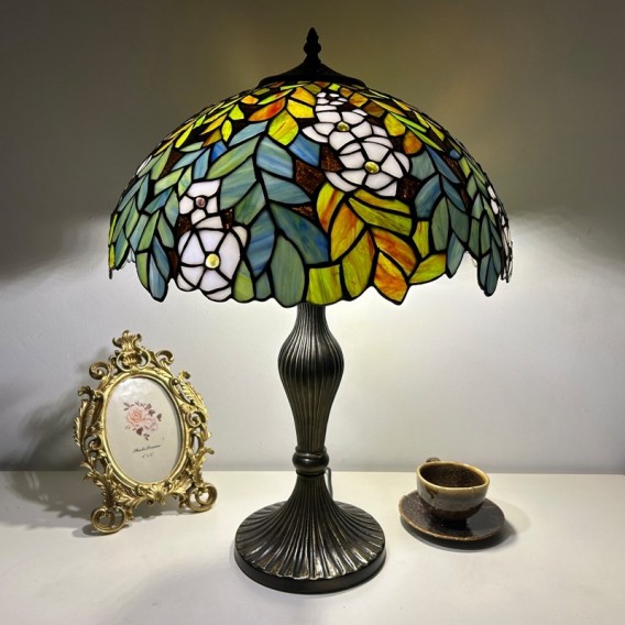 Ръчно изработена винтидж голяма 16-инчова лампа с абажур във формата на цвете, стил Тифани, витражна настолна лампа
