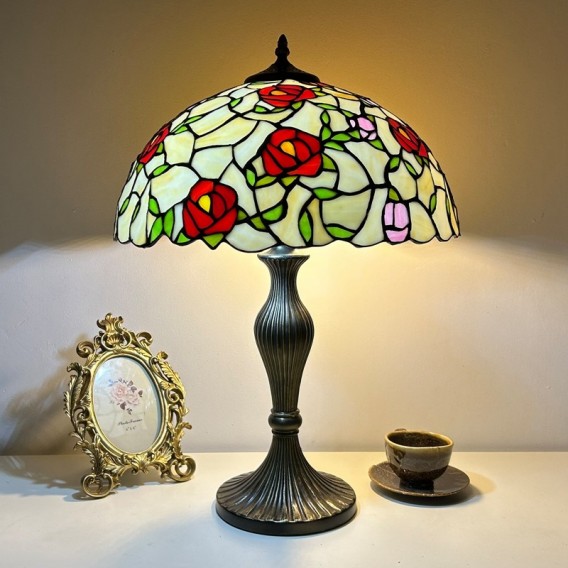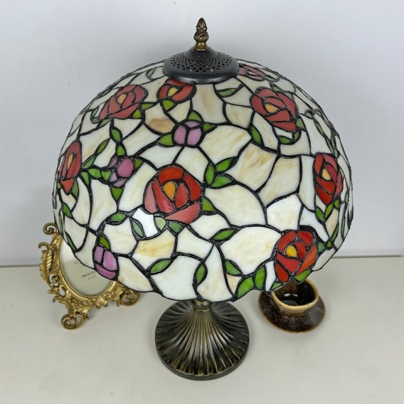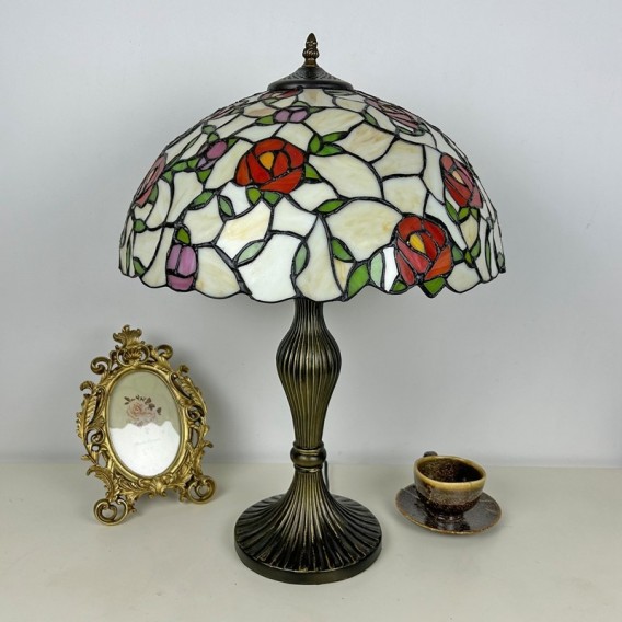 Ръчно изработена винтидж голяма 16-инчова розова абажурна лампа в стил Тифани от витражно стъкло