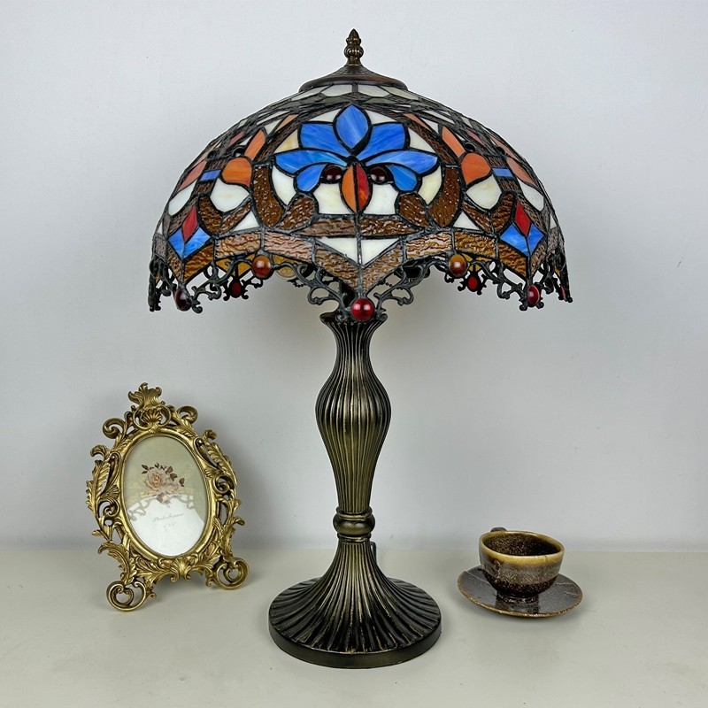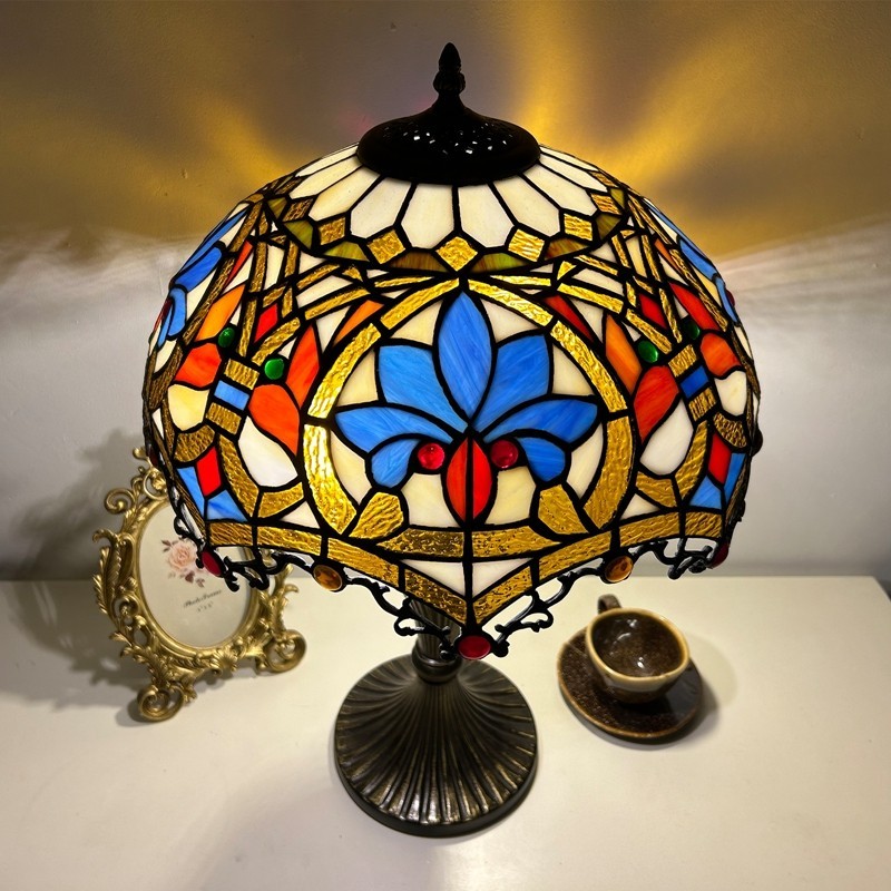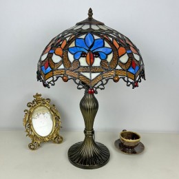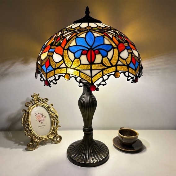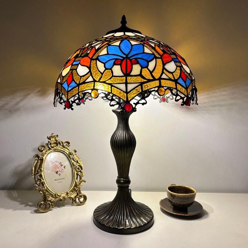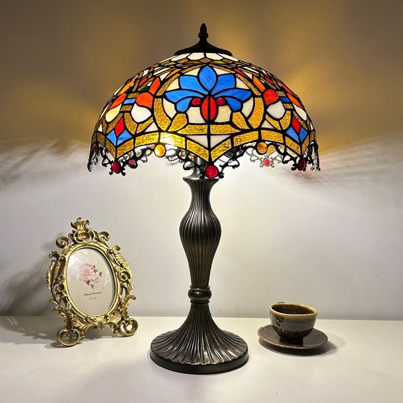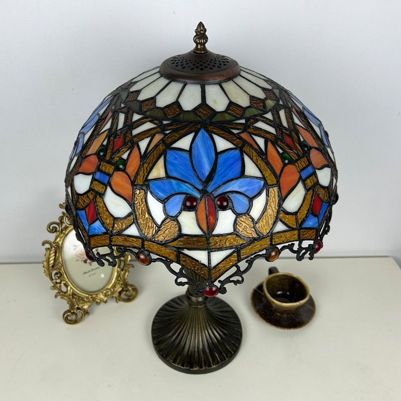 Ръчно изработена винтидж голяма 16-инчова барокова абажурна лампа в стил Тифани с витраж