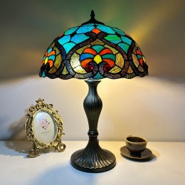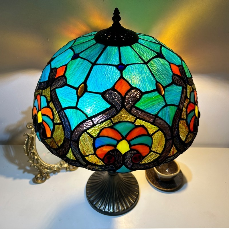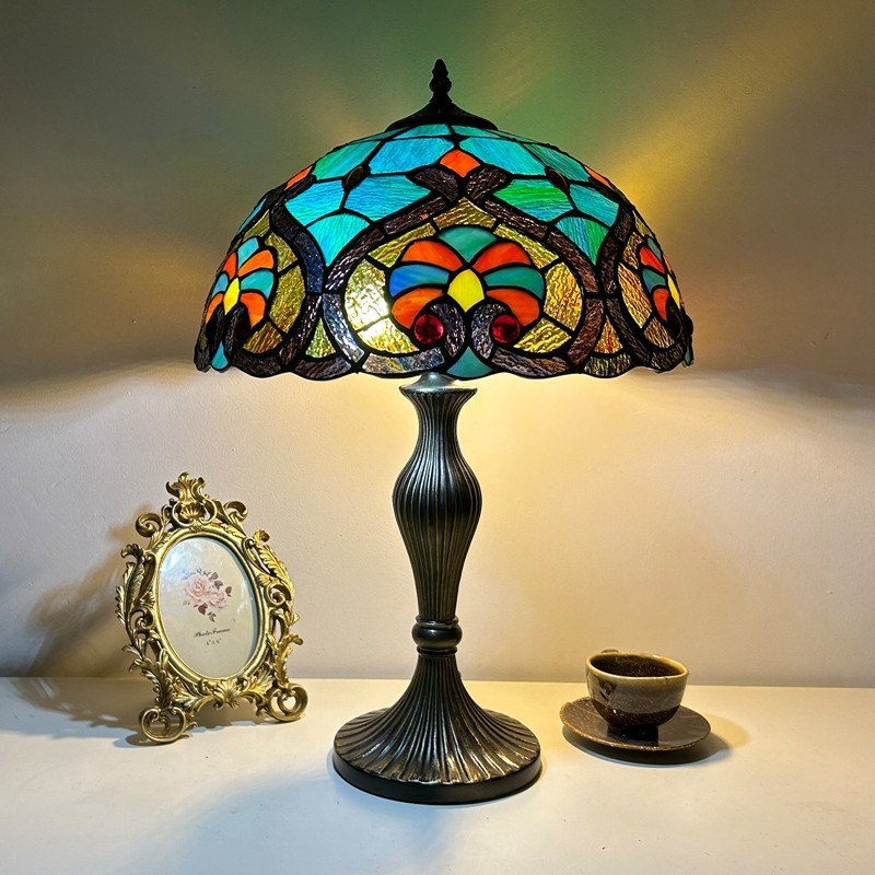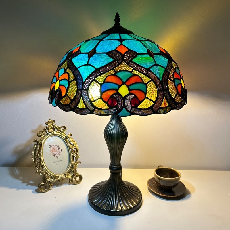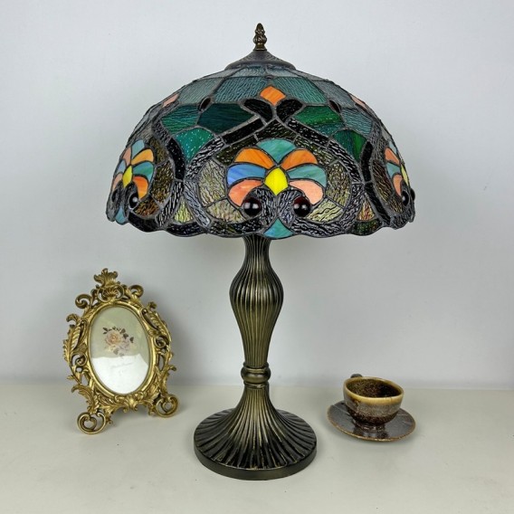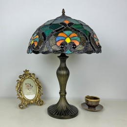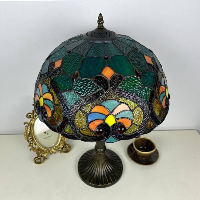 Ръчно изработена винтидж голяма 16-инчова барокова абажурна лампа в стил Тифани с витраж