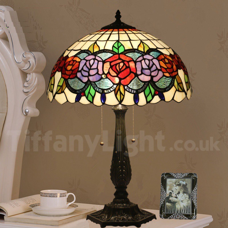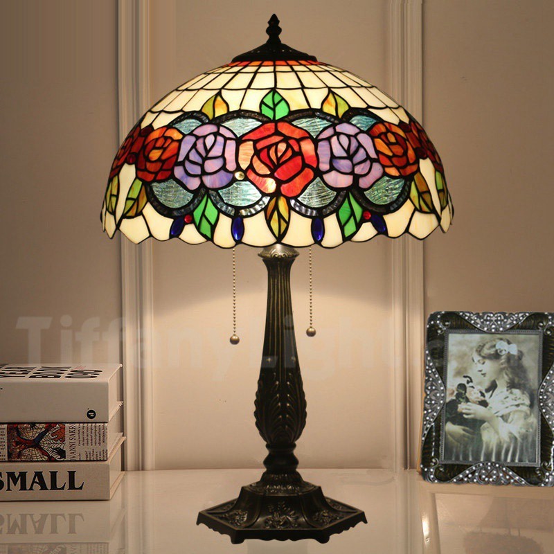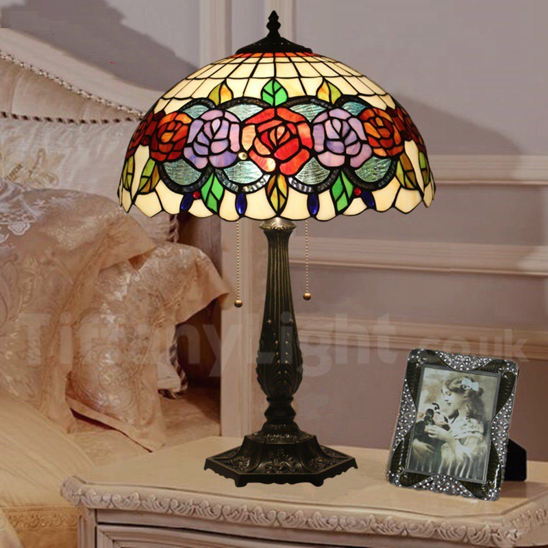 Ръчно изработена винтидж 16-инчова настолна лампа Тифани с витраж в стил роза