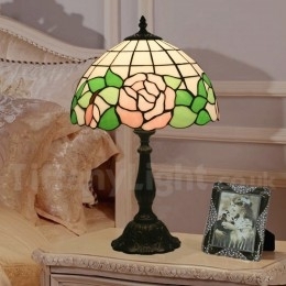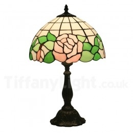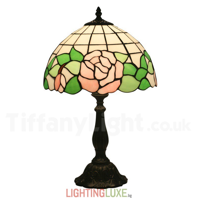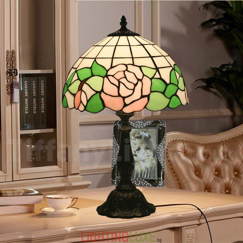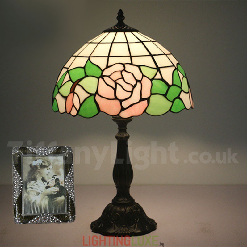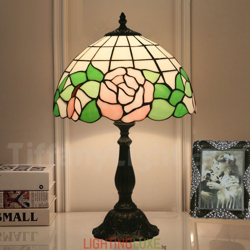 Ръчно изработена винтидж 12-инчова настолна лампа Тифани с витраж в стил роза