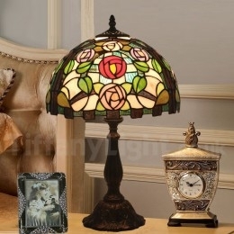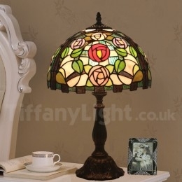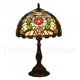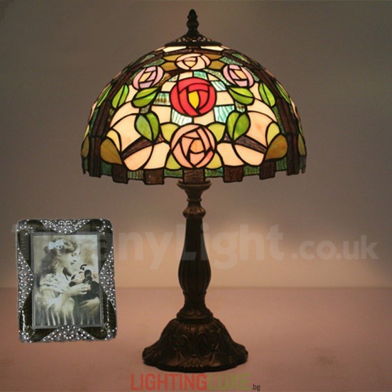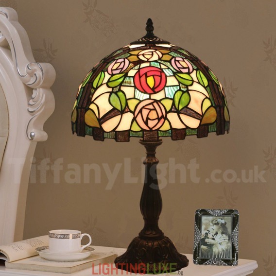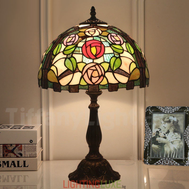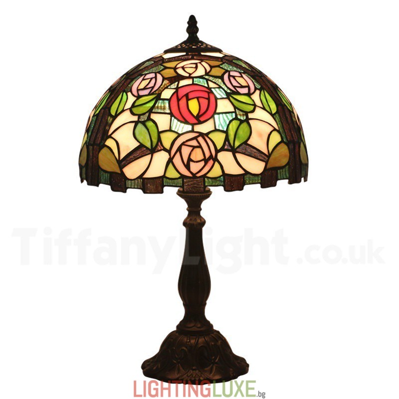 Ръчно изработена винтидж 12-инчова настолна лампа Тифани с витраж в стил роза