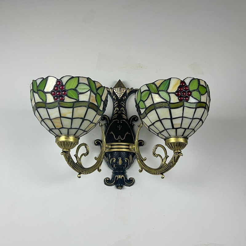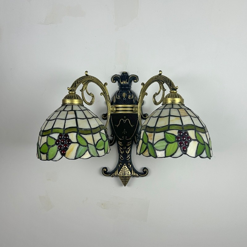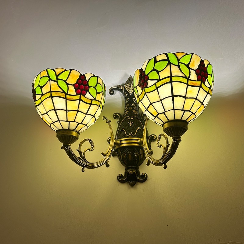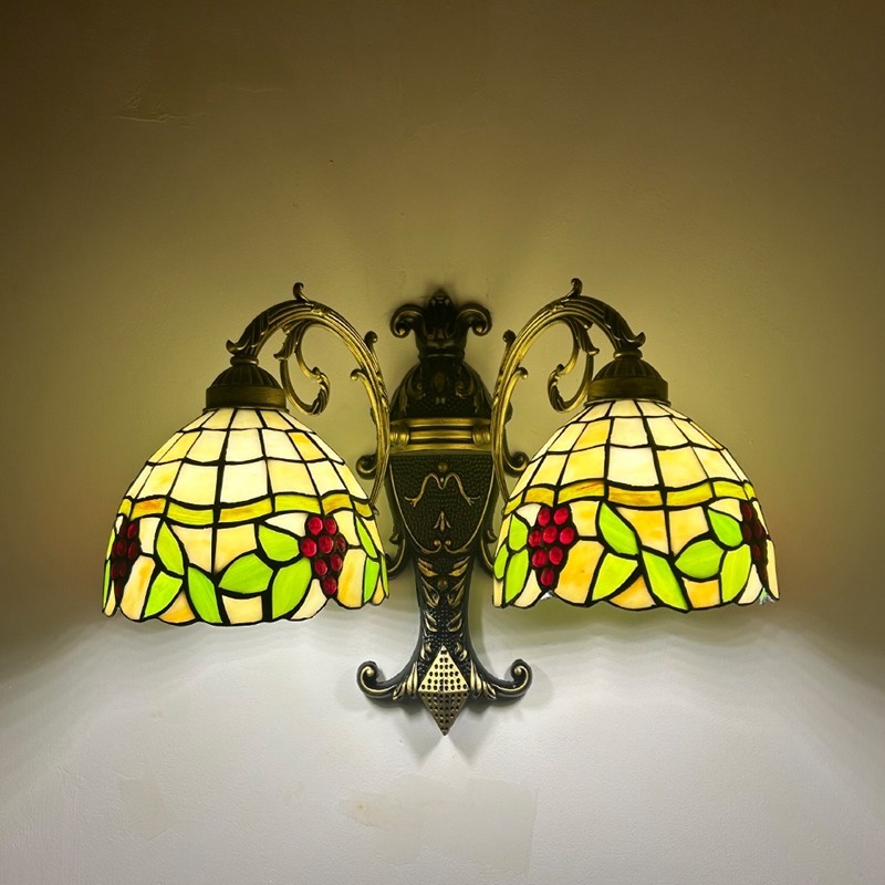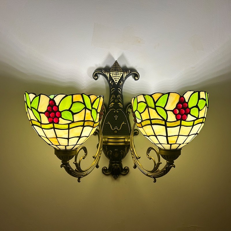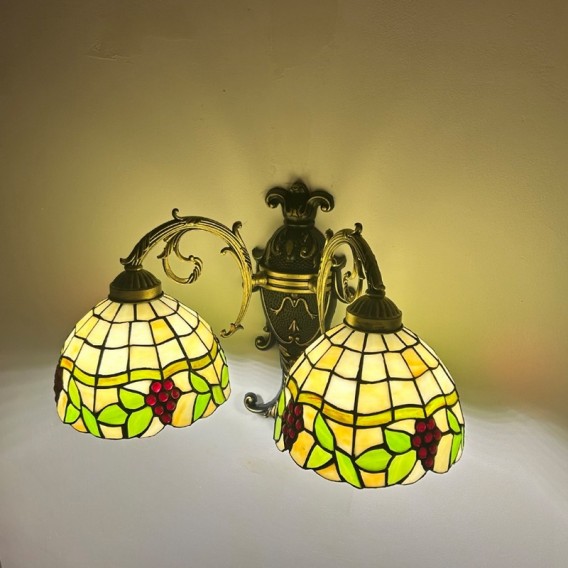 Ръчно изработен винтидж абажур от грозде в стил Тифани с витраж и стенна лампа Тифани