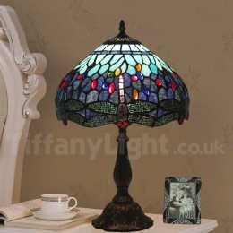 Ръчно изработена винтидж 12-инчова настолна лампа Тифани с витраж и водно конче