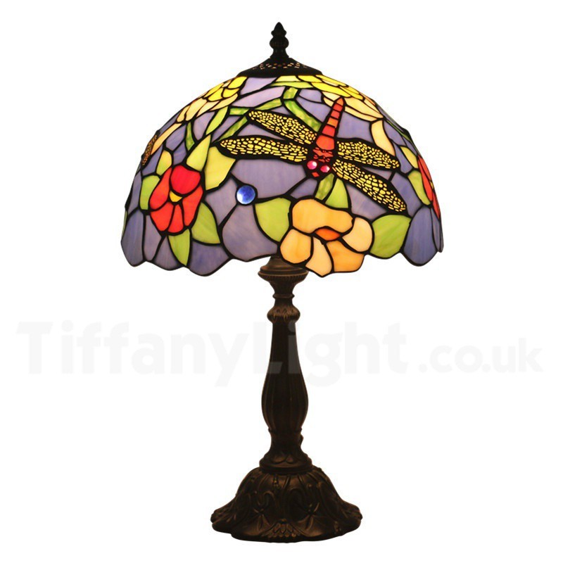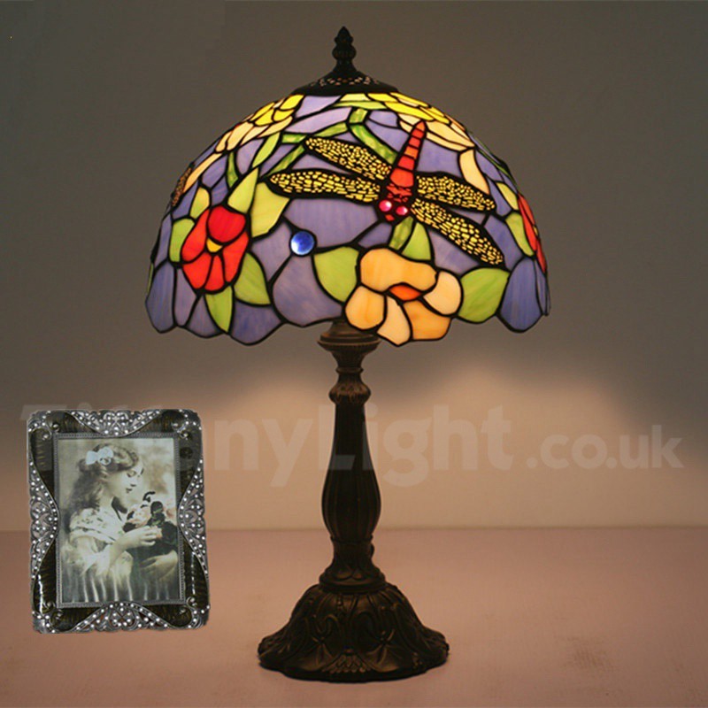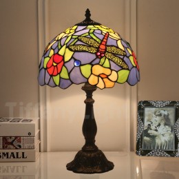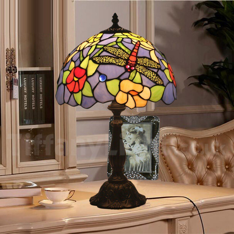 Ръчно изработена винтидж 12-инчова настолна лампа Тифани с витраж и водно конче