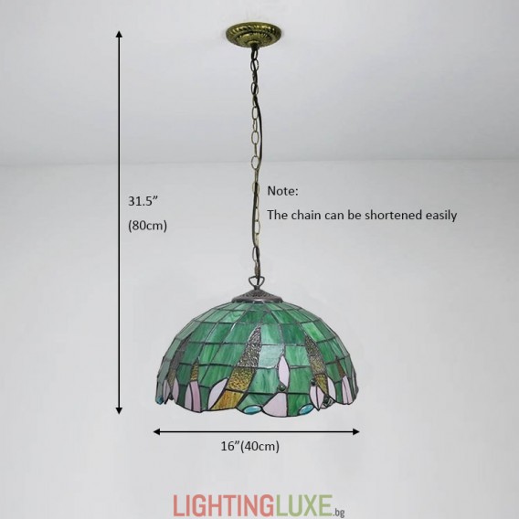 Ръчно изработена винтидж 16-инчова висяща лампа в стил Тифани от витраж, винтидж зелена витражна таванна лампа